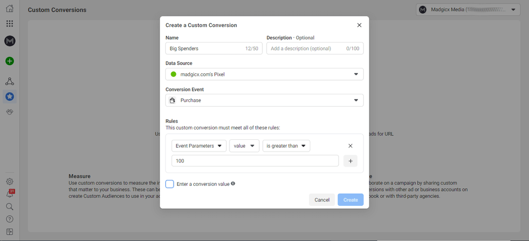 - Click on the “Create Custom Conversion” button and enter a name for your custom conversion.